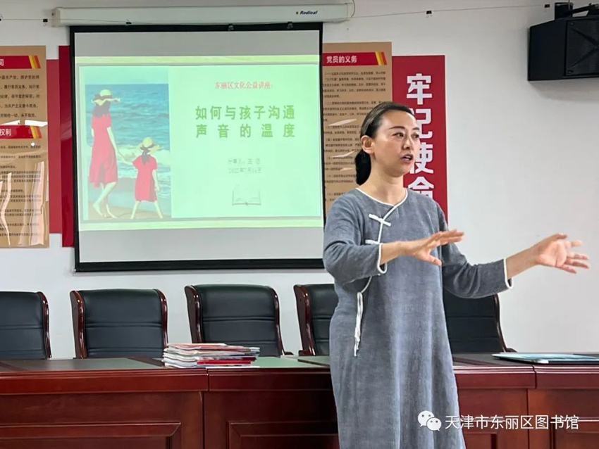 沟通是家庭教育的重要环节,有效的沟通能够帮助家长与孩子建立和谐的亲子关系,和谐的关系是家庭教育的基础,为提升居民亲子教育技巧,7月14日上午东丽区图书馆邀请国家一级播音员、心灵悦读发起人王悠老师在军粮城军祥园街道文体中心3楼会议室为居民开展以“如何与孩子进行有效的沟通——语言的温度”为主题的“津丽大讲堂”文化公益讲座。