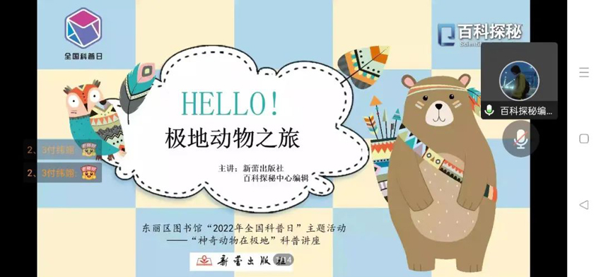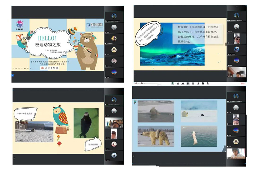9月20日下午,东丽区图书馆联合新蕾出版社组织了一场内容丰富、形式生动有趣的极地动物之旅。此次邀请的授课专家是少儿科普杂志《百科探秘·玩转地球》编辑冯兰馨老师,通过腾讯会议,她为东丽区东羽小学同学们带来了一场以“神奇动物在极地——极地动物之旅”为主题的“津丽大讲堂”科普公益讲座。