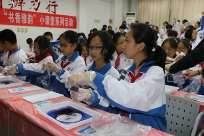 10月22日,扎染活动于天津耀华滨海学校举行,图书馆志愿者讲师布置活动现场后,活动于下午3点30分开始。本次活动到场参加的同学人数90余人。老师先介绍扎染这门古老手艺的历史,然后深入浅出的讲解扎染技法,同学们都听得聚精会神,仿佛打开了新世界的大门。扎染之美,来源于匠人之心,亦来源于大地的馈赠。换一个角度看扎染,就能看到一个前所未见的奇妙微观世界。