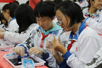 接下来进入创意环节,大家根据各自的创意,用皮筋把布料扎出不同的形状。老师手把手的指导,如何折叠,哪里要扎紧……同学们都把这些小技巧默默的记在心里。大家有天马行空的创造力,每个人都是艺术家。短短时间内,大家都已经已经掌握了扎染的基本手法。