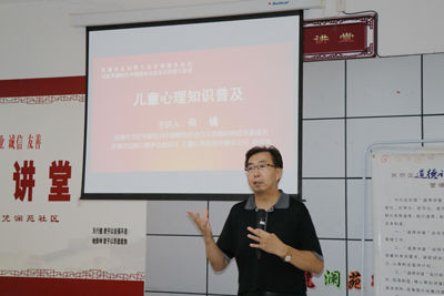 为指导家长掌握科学教子的方法,促进家长和孩子共同成长,7月25日上午,东丽区图书馆《津丽大讲堂》联合天津市社科联《理论超市》、天津图书馆《海津讲坛》特邀天津市法制心理学会副会长、儿童心理咨询专业委员会主任伯镛老师作为主讲嘉宾来到东丽湖街道凭澜苑社区,为社区的家长和孩子们讲授《做阳光少年要从“沟通”开始》。
