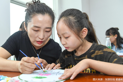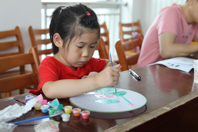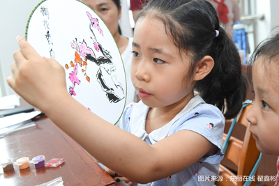 随后第二部分小读者自制团扇,图书馆工作人员为读者发放团扇、折扇、颜料和模版等工具。小读者与家长一起动手绘制团扇,近距离了解我国的团扇文化,加深小读者对于扇文化的记忆。