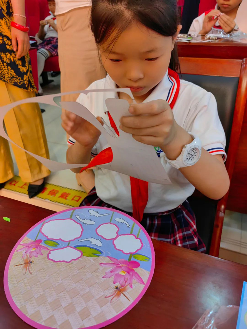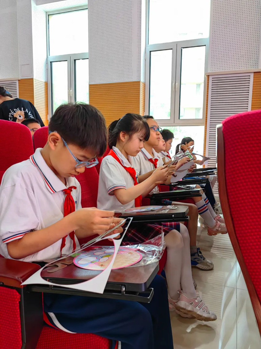 活动开始,图书馆老师向同学介绍了雨是怎么形成的、暴雨等级划分、雨天安全小常识及防溺水等安全小常识。并在其中穿插讲解关于描写与“雨”“池塘”“湖泊”有关的诗词。讲解结束后让孩子们把刚才学到的诗词用粘贴画的方式动手做出来,让他们在科普中领会古诗词的魅力。