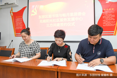 为深入贯彻十九大精神,加强基层党组织的建设,努力构建共驻共建党建工作新格局,5月15日上午,东丽区图书馆党支部与无瑕阳光社区服务发展中心党支部、无瑕街畅月里社区党支部三方结成共建单位,图书馆党支部委员曹振玲、无瑕阳光社区服务发展中心党支部书记王庆恩和畅月里社区居委会党支部书记肖文分别代表三方出席签约仪式。