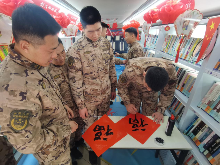 军民鱼水一家亲,文化拥军润军心。为营造浓厚的双拥社会氛围,进一步丰富军营的文化生活,让全民阅读走进军营,1月26日,东丽区图书馆流动服务车开进武警天津总队执勤第四支队,开展“新春福字进军营 翰墨书香情谊深”送书香进军营新春系列特别活动。