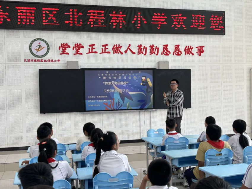 为了唤起少年儿童对海洋的关注,进一步科普海洋知识,东丽区图书馆“图书馆里的阅读课”走进北程林小学开展了“探索大海的秘密”——科技周主题阅读实践活动。