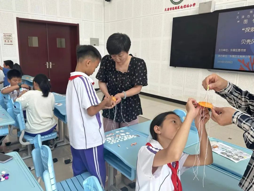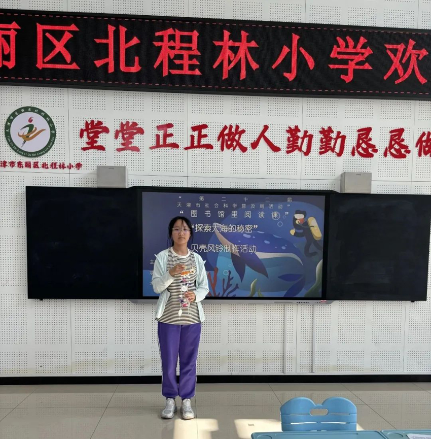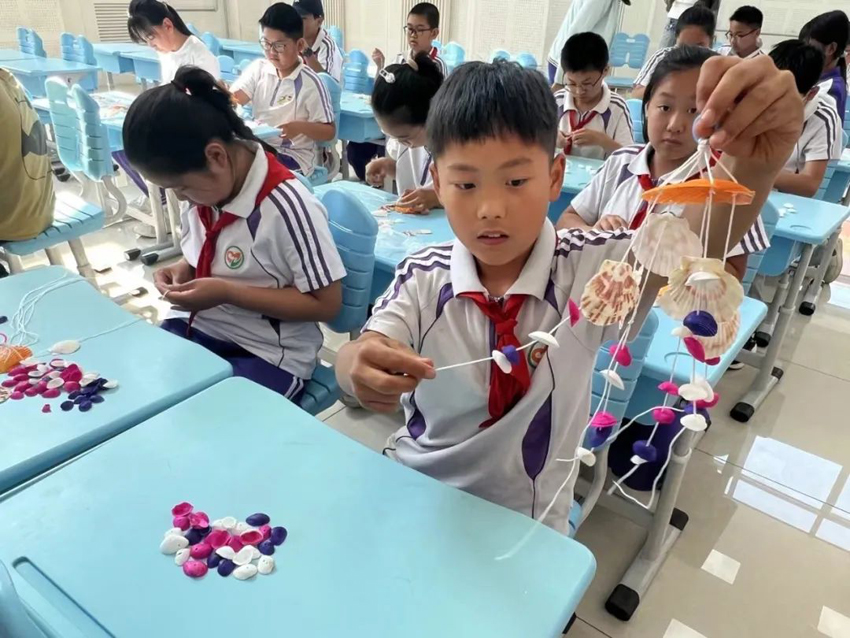 随后,图书馆老师为大家带来了贝壳风铃制作活动。同学们动起手来,用一片片美丽的贝壳制作出了精美的风铃挂件。清风拂过,叮当作响,在风铃的响声和同学们的笑声中,大家对神秘美丽的大海有了更深入的了解。