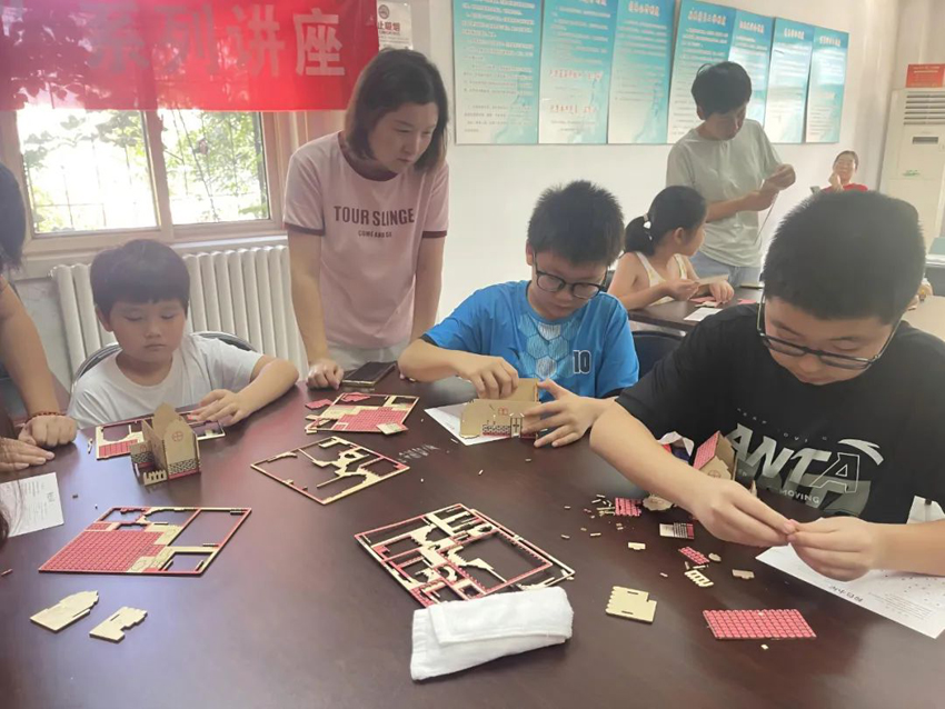 除了讲座环节外,活动还设置了互动问答和手工制作环节。在互动问答环节中,孩子们纷纷举手提问,积极与老师互动,现场气氛十分活跃。而在手工制作环节中,孩子们则在工作人员的指导下,亲手制作了简易的“古代房屋”模型。他们认真地剪裁纸片、粘贴材料,通过自己的努力完成了作品,脸上洋溢着满足和自豪的笑容。