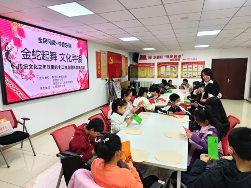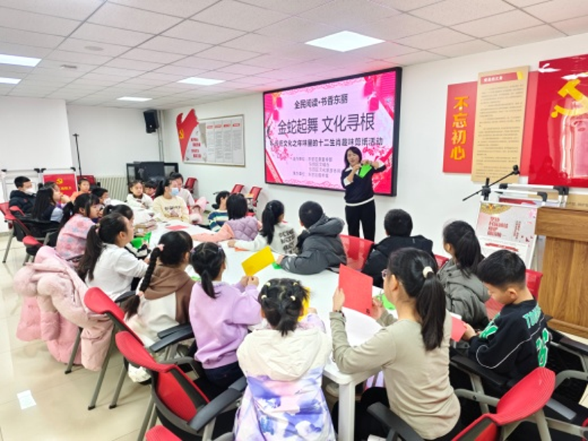 东丽区图书馆流动服务车联合怡盛里社区组织开展“金蛇起舞 文化寻根”传统文化之年味里的十二生肖趣味剪纸活动