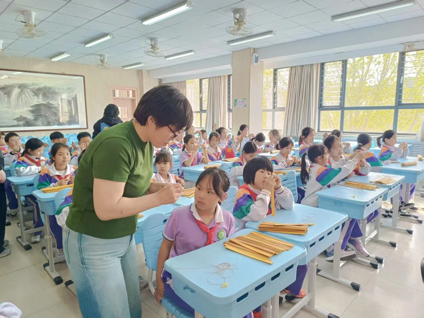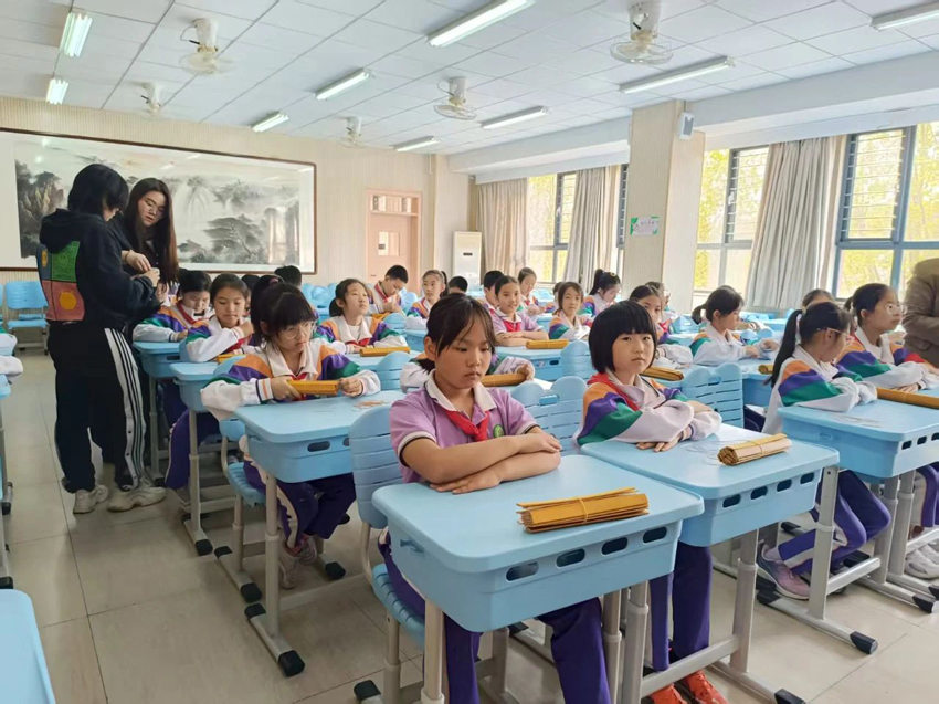 活动现场,我们精心准备了竹简、丝线等传统工具。并在老师的讲解下,学生们了解到了从选竹、削片、钻孔到编联的完整流程。当一片片竹片在指尖串联成册,孩子们不仅感受到古人的智慧与匠心,更深刻体会到“韦编三绝”背后的治学精神。一位参与活动的学生感慨道:“原来古人读书这么不容易,我以后一定要珍惜现在的书籍!”华新小学老师表示:“这样的活动让传统文化‘活’了起来,孩子们在动手实践中增强了文化认同感。”