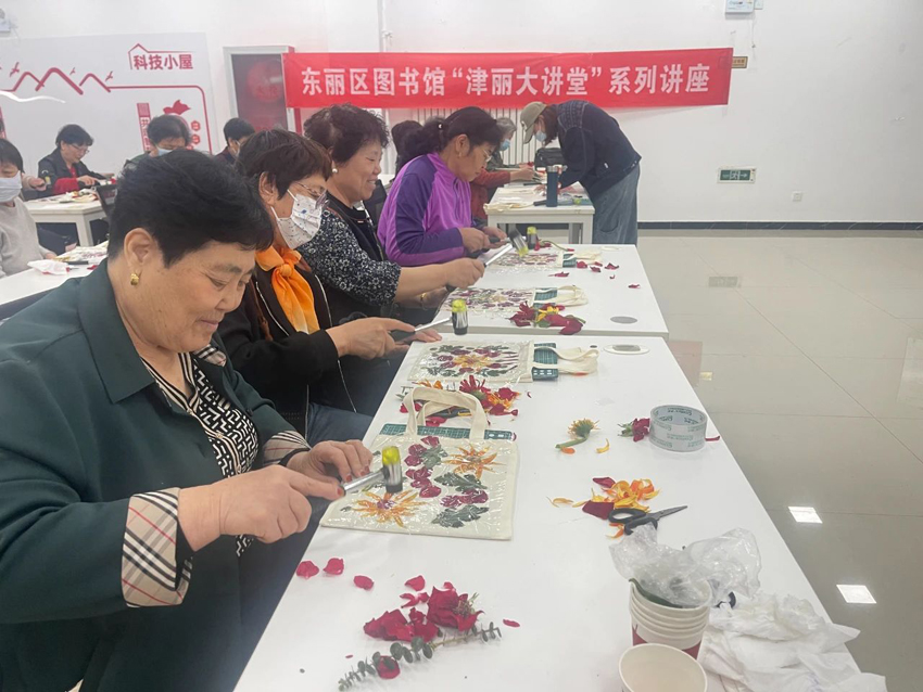 近日,东丽区图书馆“津丽大讲堂”在新立街道海雅园社区党群服务中心成功举办了一场别开生面的文化公益讲座——《留住春天的颜色 把春天‘袋’回家》植物拓染活动。