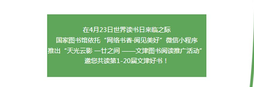 我们的中国梦·文化进万家 | 东丽区图书馆4.23系列活动之“网络书香·阅见美好”小程序邀您共赏文津好书
