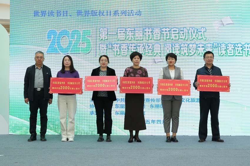 启动仪式现场,中国邮政集团天津市东丽区分公司负责人介绍公益图书展卖活动,并向东丽区5所学校捐赠价值万元的图书。活动中,课本剧《狼牙山五壮士》、集体朗诵《中华孝道》、朗诵《风光无限东丽湖》等文艺展演精彩纷呈,与会领导为东丽区优秀读书人物、新时代阅读推广人、优秀阅读品牌、书香家庭颁奖,并共同启动2025东丽区世界读书日主题活动。