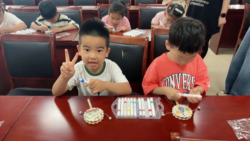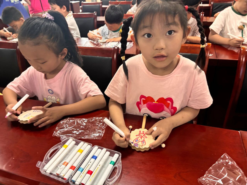 终于到了最期待的“手绘大作战”环节!小朋友们化身“小小毕加索”,拿起画笔,在空白拨浪鼓上尽情挥洒创意。瞧,有的小朋友画上了五彩斑斓的彩虹,有的画上了憨态可掬的小动物,还有的画上了自己最爱的玩具……每一个拨浪鼓都变成了独一无二的艺术品,承载着孩子们天马行空的想象。小朋友们举着自己亲手绘制的拨浪鼓,像一群快乐的小精灵,在社区里穿梭、摇摆。鼓声、笑声、欢呼声交织在一起,奏响了一曲欢乐的六一乐章。