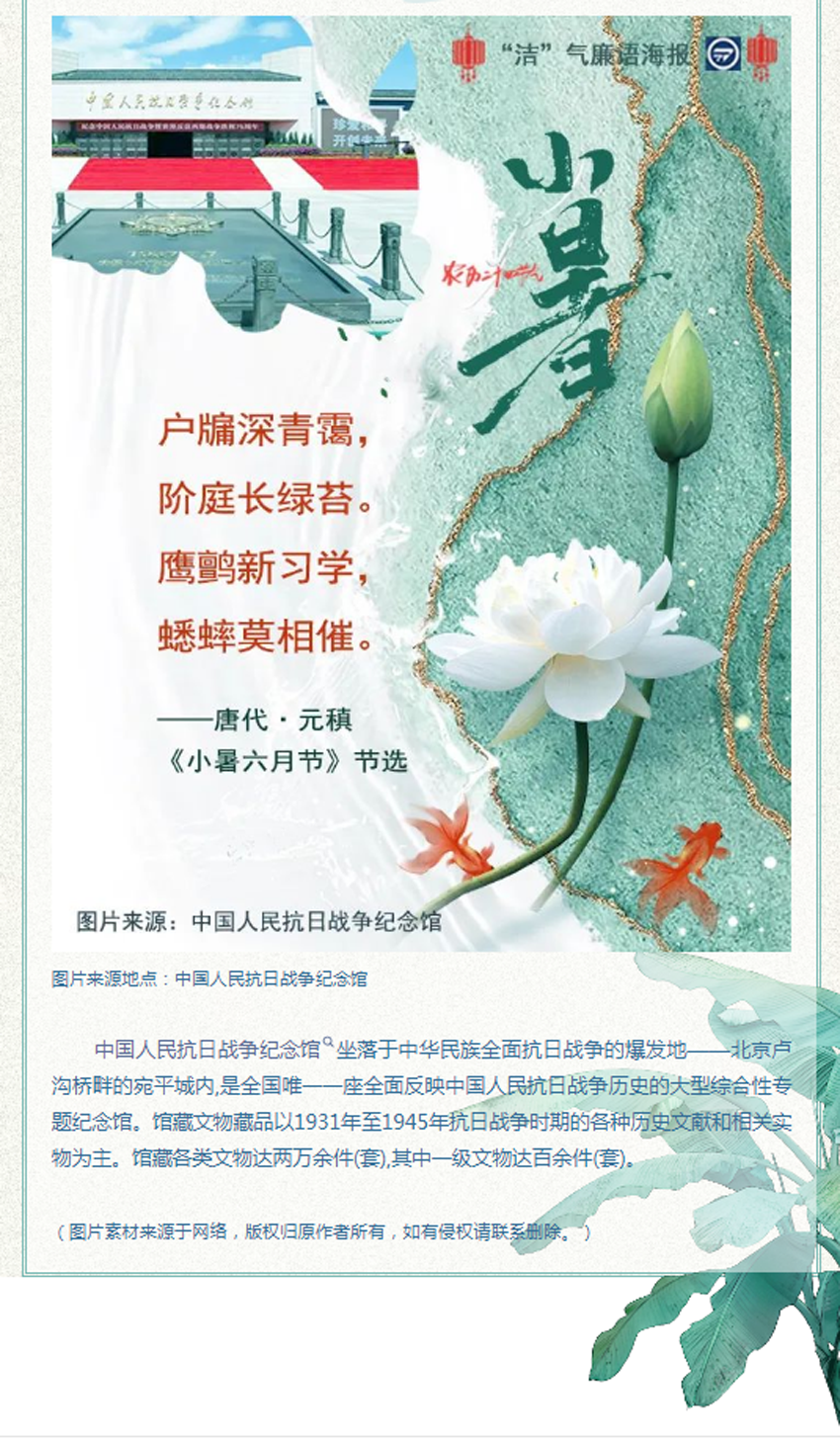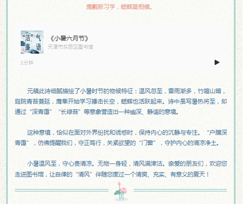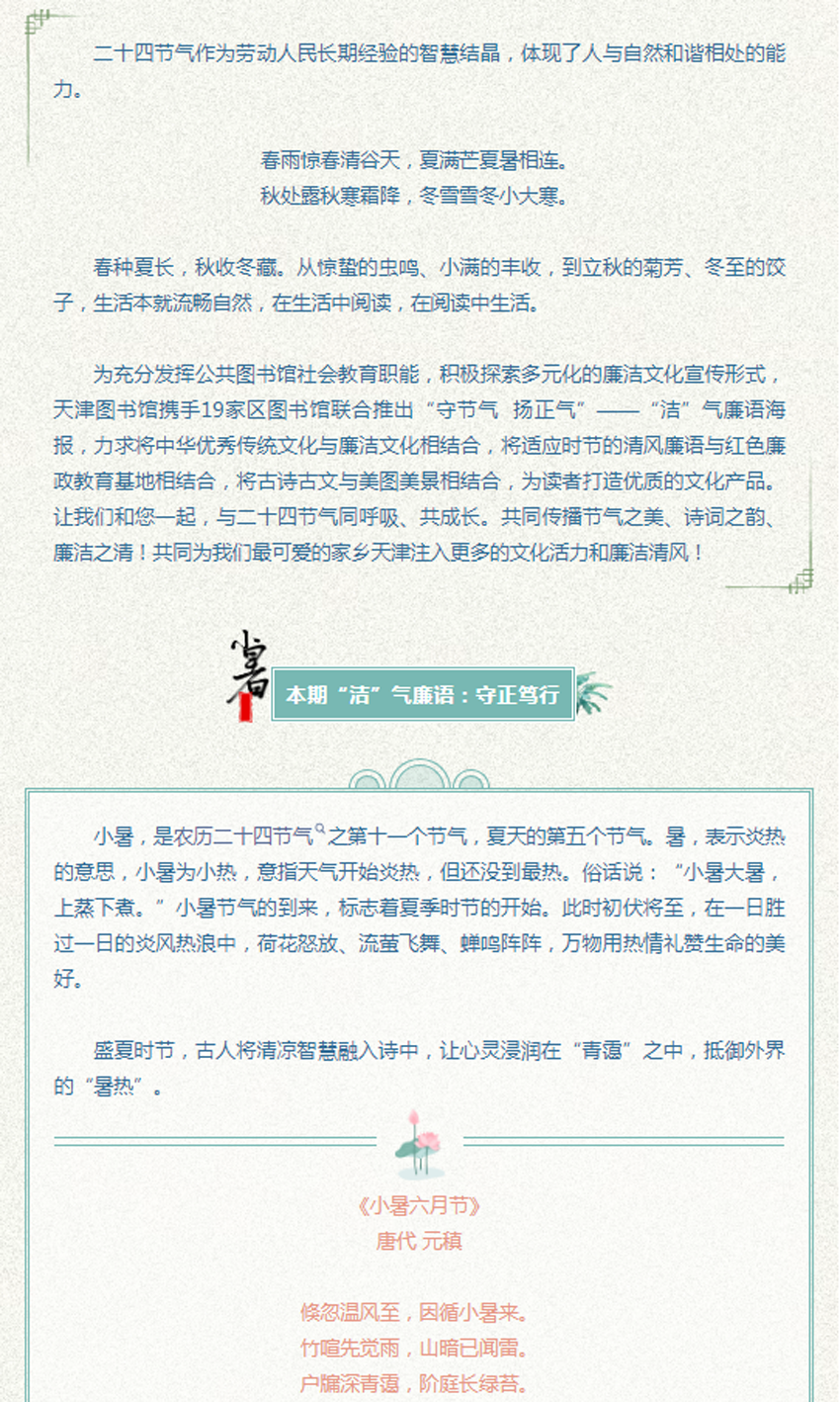 明日小暑丨天津图书馆“守节气 扬正气”——“洁”气廉语海报