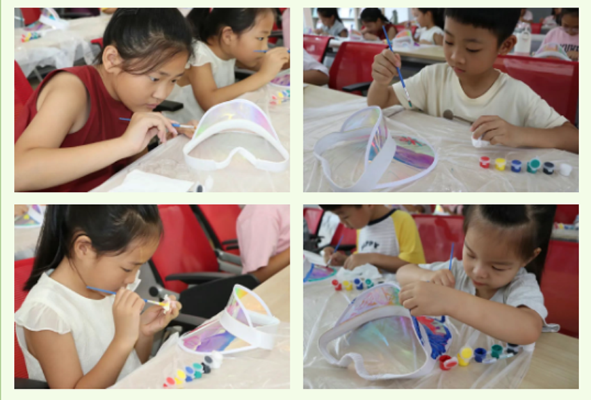 讲座后,活动无缝衔接为趣味手工环节。孩子们在老师指导下,亲手绘制、制作防暑太阳帽。他们不仅将夏日乐趣戴在头上,更巧妙地将刚学到的安全警示标识等重要信息融入设计。当孩子们戴上自己设计、印有“安全护航”理念的太阳帽,知识的种子已在轻松愉快的氛围中悄然播下。