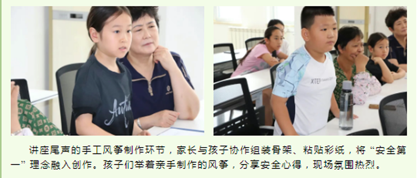 讲座尾声的手工风筝制作环节,家长与孩子协作组装骨架、粘贴彩纸,将 “安全第一” 理念融入创作。孩子们举着亲手制作的风筝,分享安全心得,现场氛围热烈。