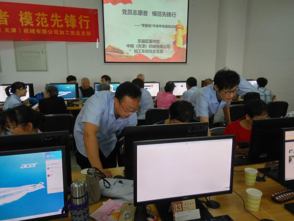 6月26日上午,区图书馆携手中核(天津)机械有限公司加工车间党总支部举办‘党员志愿者 模范先锋行’“零基础”中老年电脑培训班主题党日活动,车间党总支部书记张长秋带领20名中核党员干部,以志愿者的身份,活跃在图书馆二楼电子阅览室,为中老年电脑培训班学员答疑解惑,进行一对一辅导,用细心、爱心与温情,践行志愿服务精神,彰显青年青春风采。