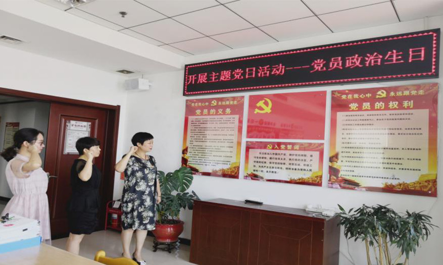 “我志愿加入中国共产党,拥护党的纲领,遵守党的章程……”几位党员举右手握拳,重温入党宣誓仪式。熟悉的场景,铿锵有力的声音,使大家重回那神圣的时刻,再次点燃曾经的激情,让大家更加坚定对党的忠诚,全心全意投入到工作之中,为人民服务。
